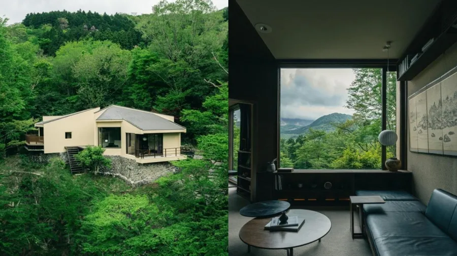 箱根森林私宅「AKNOT HAKONE」!結合中世紀設計與現代感,旋轉空間讓訪客與自然無縫連結,大窗可飽覽大涌谷美景。